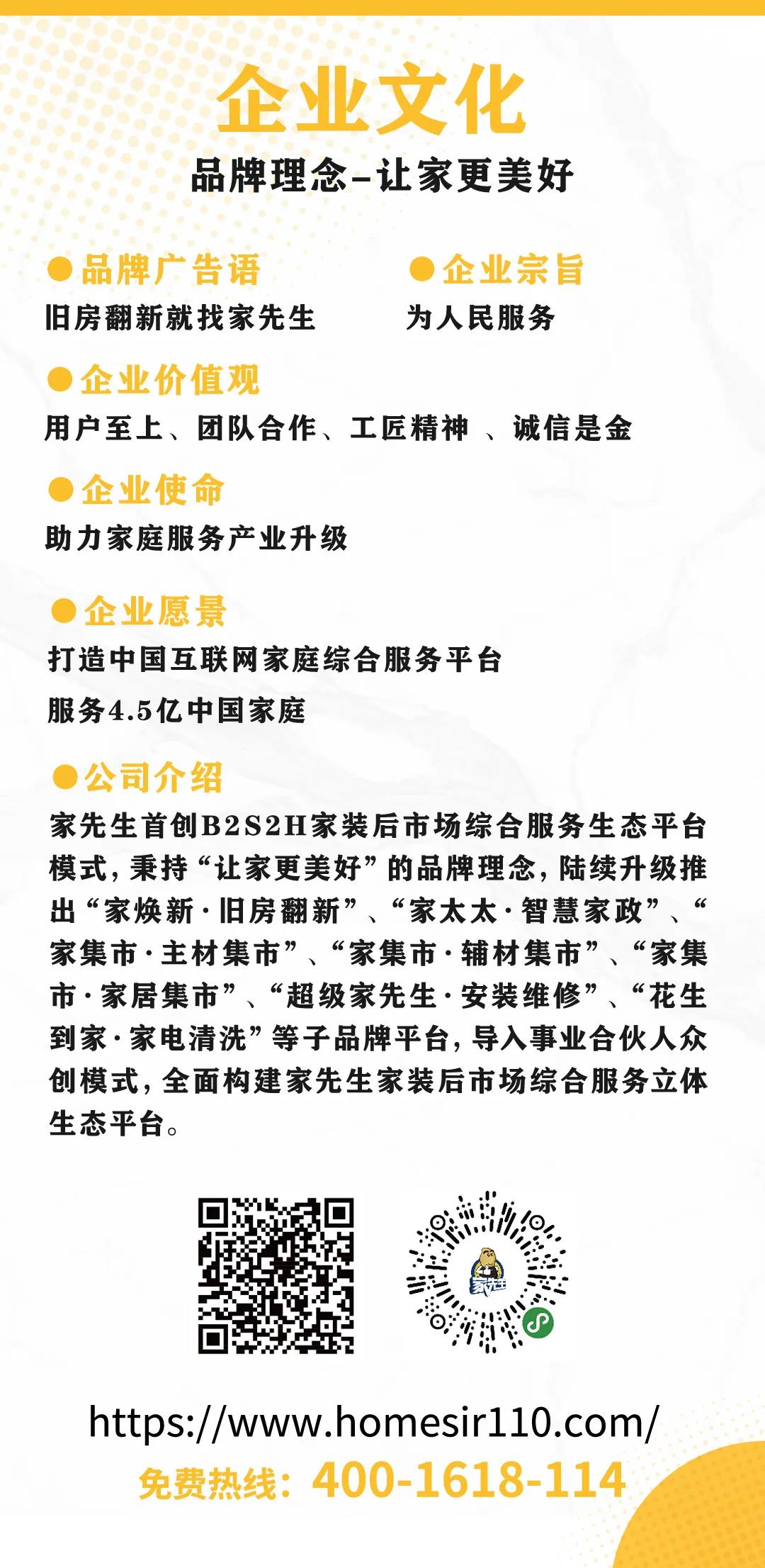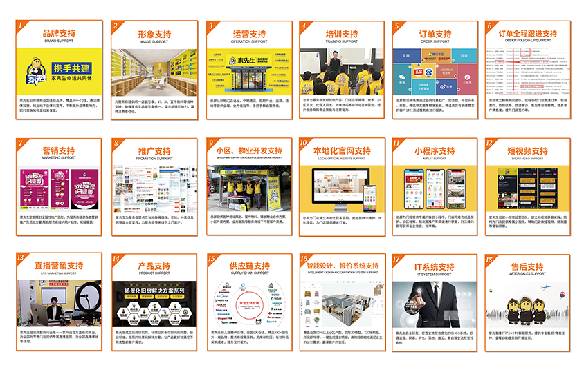 家先生拥有强大的品牌势能及行业领先的赋能服商体系,金牌督导1对1门店学习期快盈利帮扶;金牌翻新1对1全流程订单跟进促成交;总监1对1运营帮扶;更有18大服商支持保全程!强势赋能服务商!