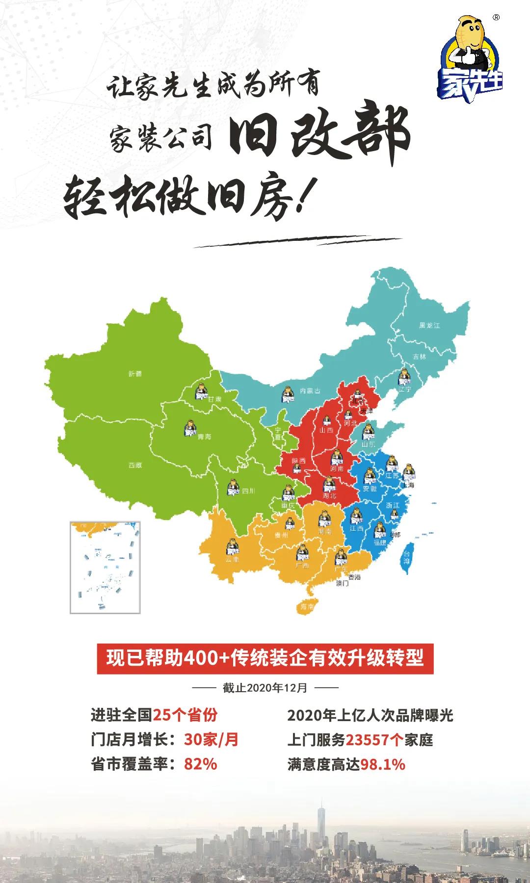 经过将近5年的不懈努力,家先生在旧房翻新领域的知名度不断提升,现已布局全国B2S2H新零售门店400+,进驻全国25个省份,覆盖全国82个区县,5个自治区,4个直辖市,75个地级市,省市覆盖率高达83%,门店月均增长达30家/月,拥有上亿人次品牌曝光,服务将近10万+万业主。