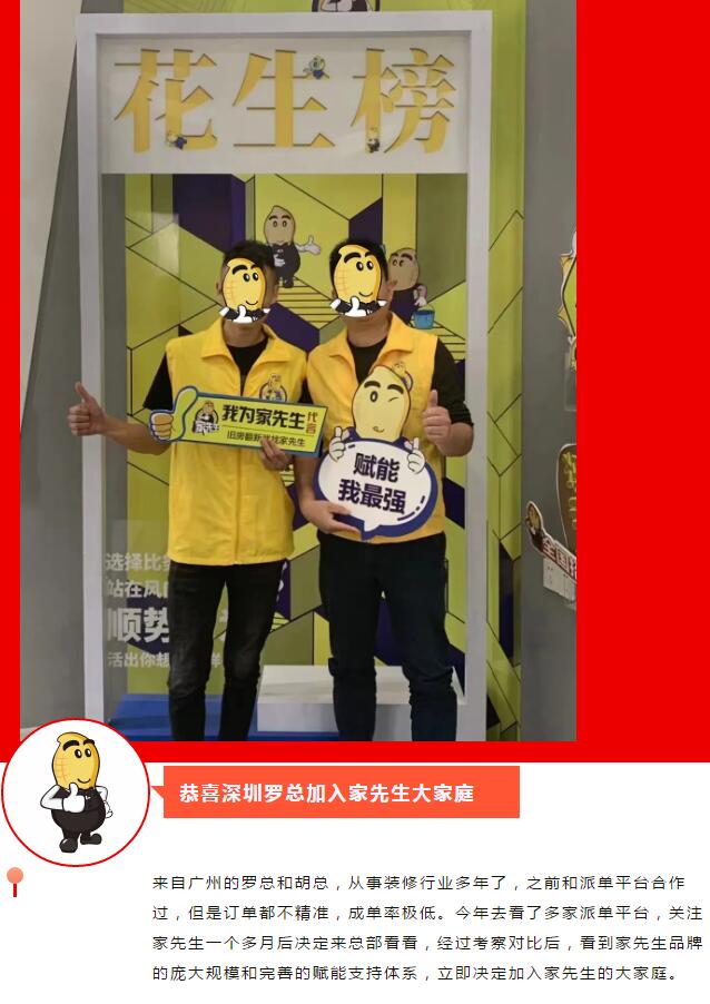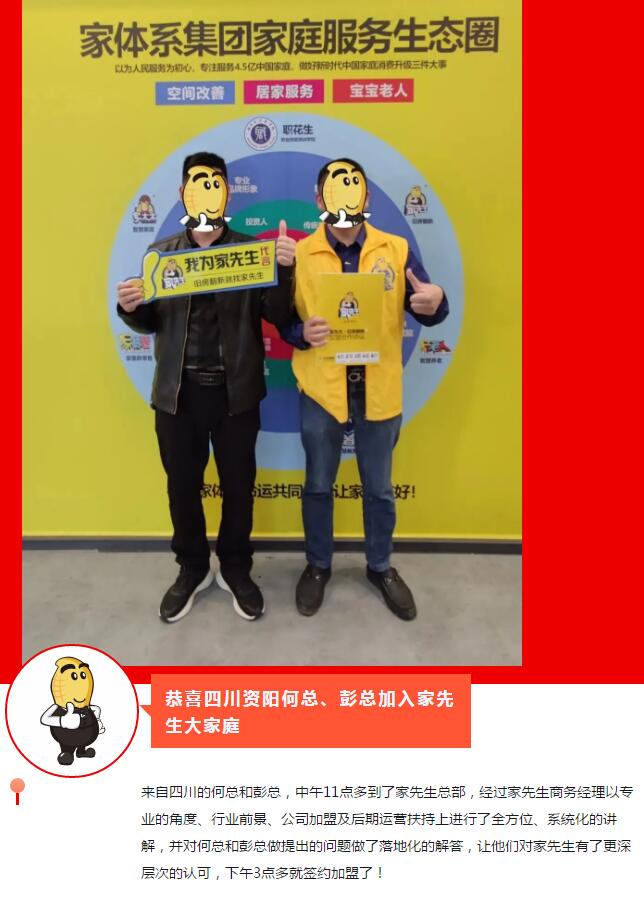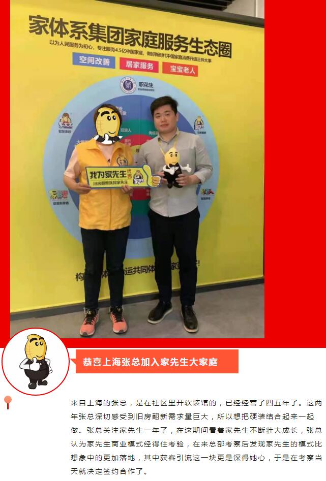 这几天,家先生总部非常热闹,许多“慕名”而来的客户陆续莅临考察,更有6组客户,在了解家先生新零售模式及多渠道盈利口后对项目充满信心,选择签约锁定活动区域及政策,成为家先生新零售连锁服务商,为家先生全国版图再添城池!