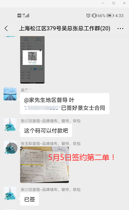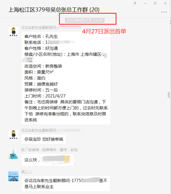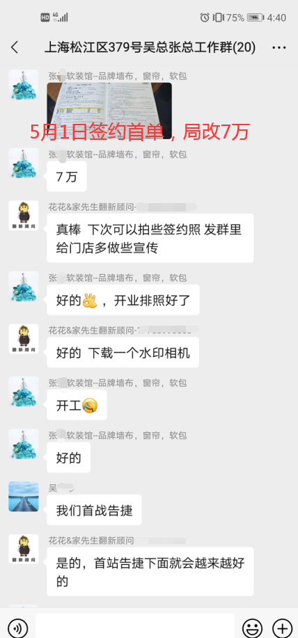 4月20日签约加盟家先生后,家先生服商团队当天就为张姐和吴姐建立了专属N对1服商群,协助门店后期高效运营。