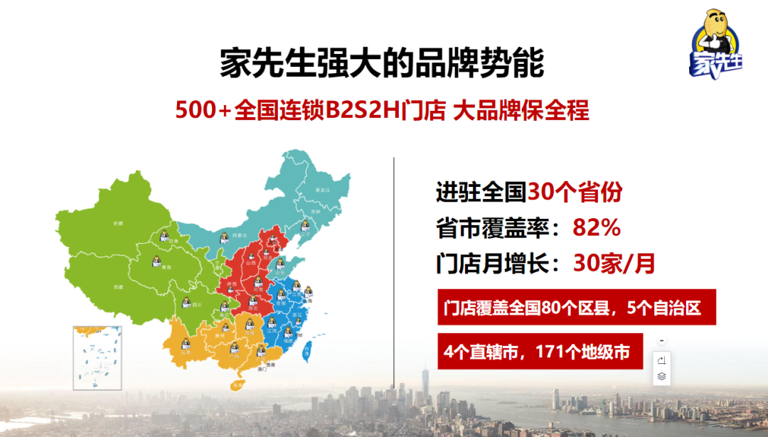 2018年10月正式面向全国招商以来,家先生的足迹已经遍布福州、北京、上海、长沙、昆山、常州、龙岩、漳州、武汉、郑州、安阳、南通、泉州、大连、吉安、盐城、中山、丹阳、九江、普洱、无锡、苏州、潍坊、邢台、赣州、张家港、南宁、安康、合肥、黔南、晋江、重庆、济南、南通、沈阳、东莞、厦门、兰州、自贡、西安、安康、晋江、信阳、扬州等地,覆盖全国25个省,拥有超过500家门店。