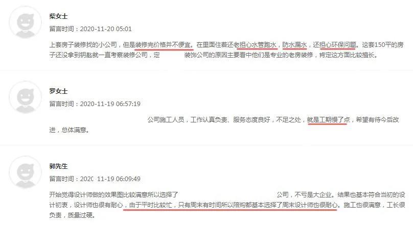 装企同样可以从留言评价中提炼出业主的痛点。重视业主反馈,把差评看成是业主对我们最好的建议,把差评背后的根本需求罗列出来,其实就是我们解决客户深度痛点的方案。
