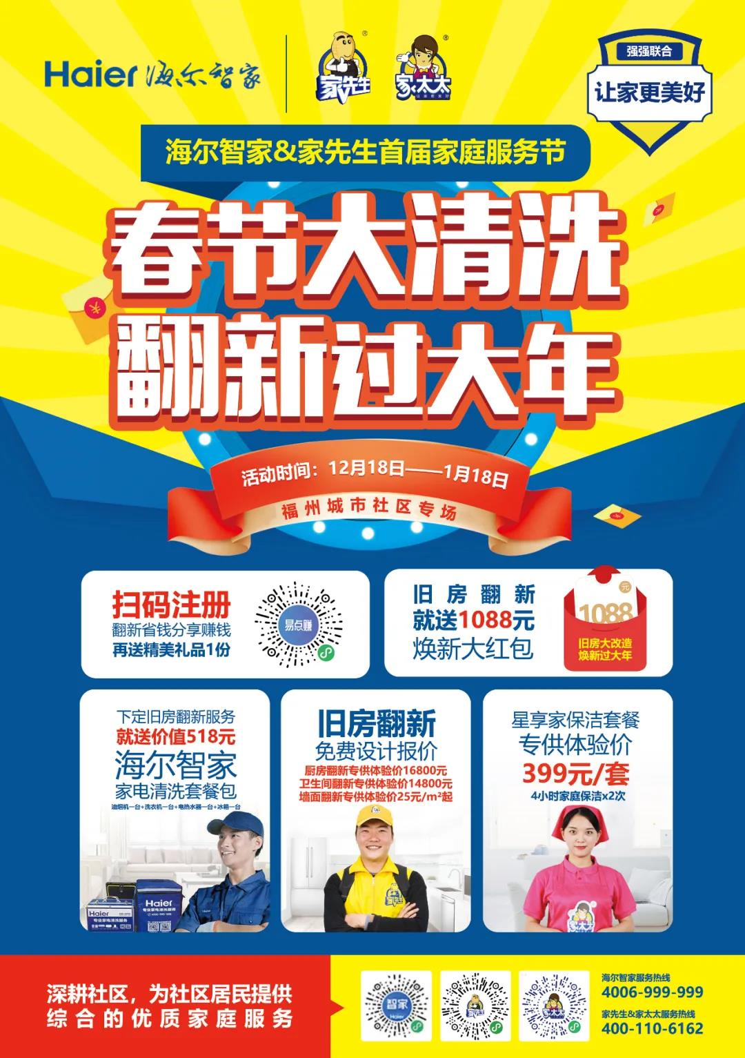 随着家先生与海创汇战略合作的开展,海尔量子小店已成功启动福州样板市场落地。秉承让家更美好的服务理念,2021海尔智家&家先生首届家庭服务节《春节大清洗·翻新过大年》福州城市社区专场活动于12月18日正式启动!活动期间下定旧房翻新服务,五重豪礼通通带回家!