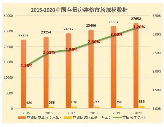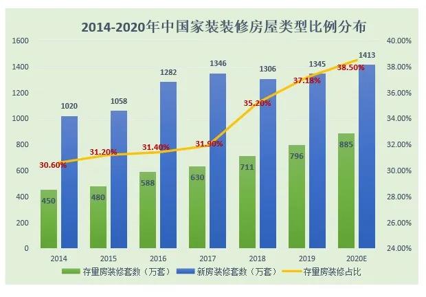 存量房时代,旧房翻新已经为家装行业唯一大蓝海市场,成为家装行业发展新增长点。根据中国装饰协会、中装信网数据,存量房装修(旧房翻新)套数逐年提升,存量房装修(旧房翻新)占比持续走高,2020年预计旧房翻新885万套,占比高达38.5%。
