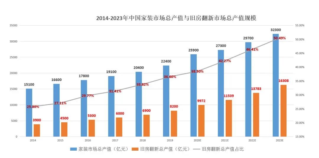 目前我国处于城镇化进程的中后期, 一线城市的新建住房市场趋于饱和,家装进入存量房时代,新房比例逐年下降,旧房装修占比逐年提升,据权威数据统计,2020年旧房翻新总产值已达到9972亿元,占比38.5%;预计2023年,旧房翻新占比将突破50%,市场总产值达到16308亿,旧房翻新已成为家装行业唯一大蓝海市场!