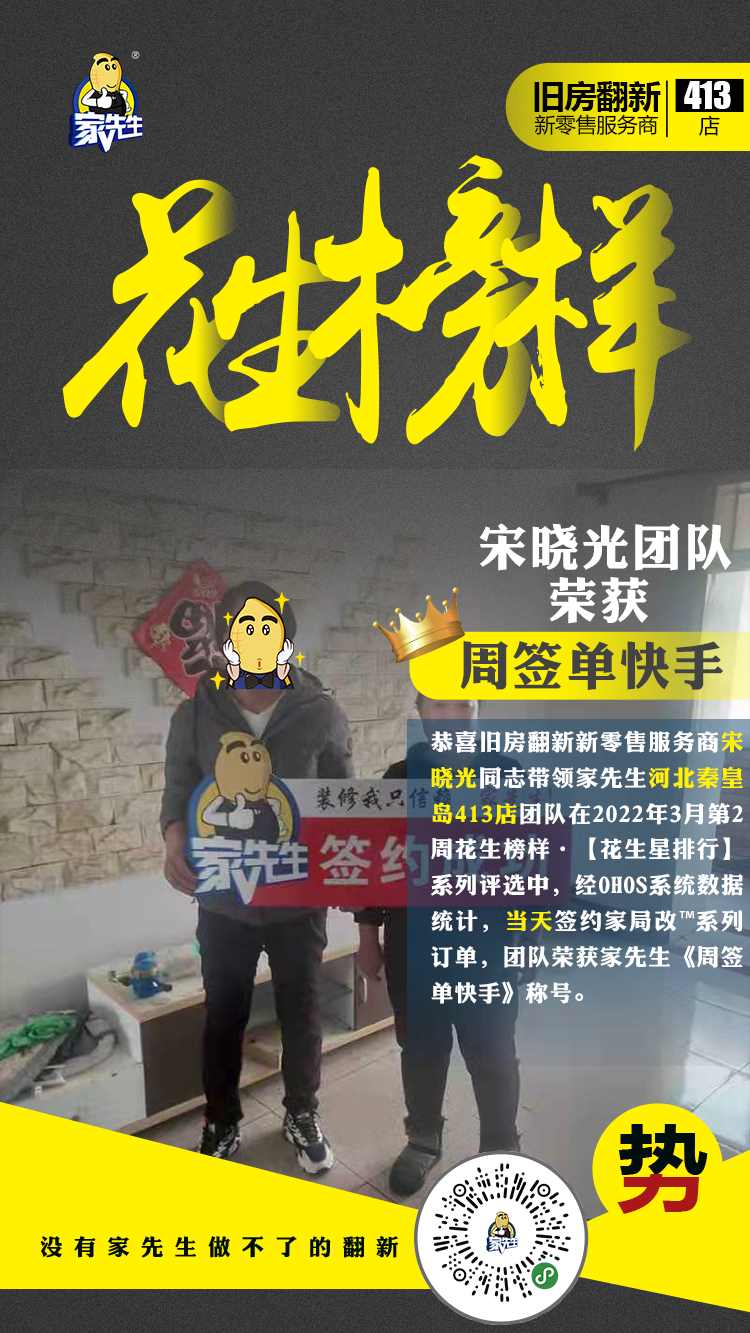 恭喜旧房翻新新零售服务商宋晓光同志带领家先生河北秦皇岛413店团队在2022年3月第2周花生榜样·【花生星排行】系列评选中,经OHOS系统数据统计,当天签约家局改™系列订单,团队荣获家先生《周签单快手》称号。