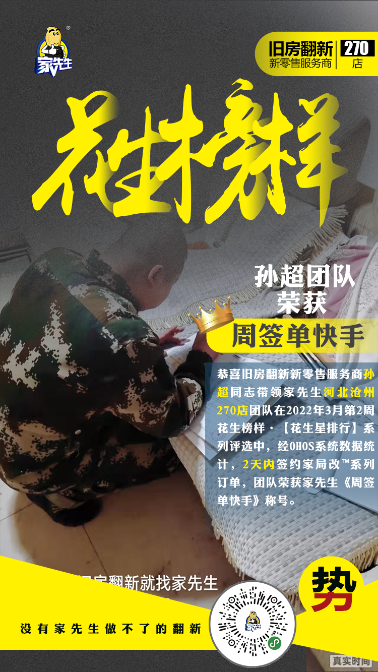 恭喜旧房翻新新零售服务商孙超同志带领家先生河北沧州270店团队在2022年3月第2周花生榜样·【花生星排行】系列评选中,经OHOS系统数据统计,2天内签约家局改™系列订单,团队荣获家先生《周签单快手》称号。
