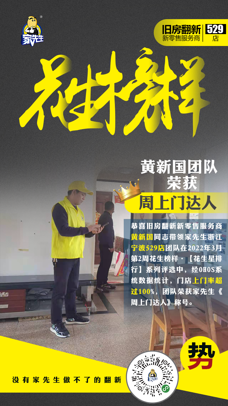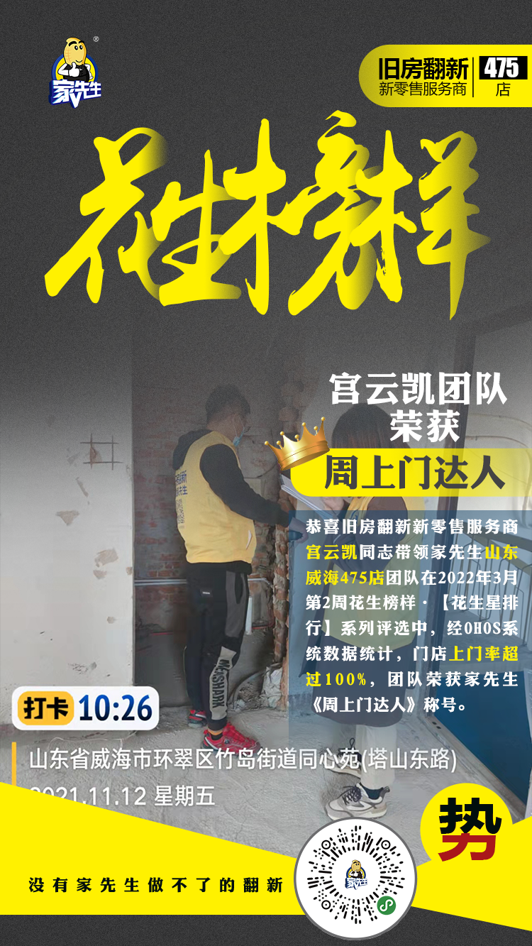 恭喜旧房翻新新零售服务商宫云凯同志带领家先生山东威海475店团队在2022年3月第2周花生榜样·【花生星排行】系列评选中,经OHOS系统数据统计,门店上门率超过100%,团队荣获家先生《周上门达人》称号。