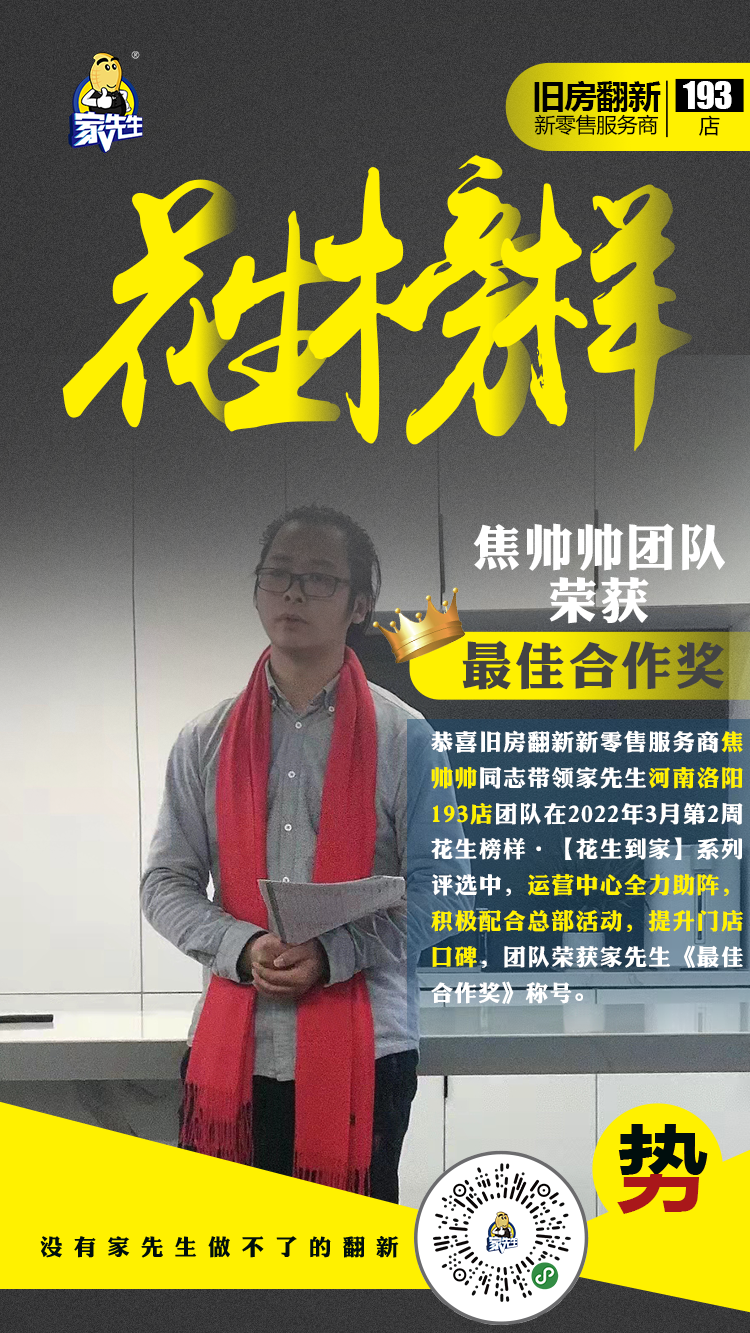 恭喜旧房翻新新零售服务商焦帅帅同志带领家先生河南洛阳193店团队在2022年3月第2周花生榜样·【花生到家】系列评选中,运营中心全力助阵,积极配合总部活动,提升门店口碑,团队荣获家先生《最佳合作奖》称号。