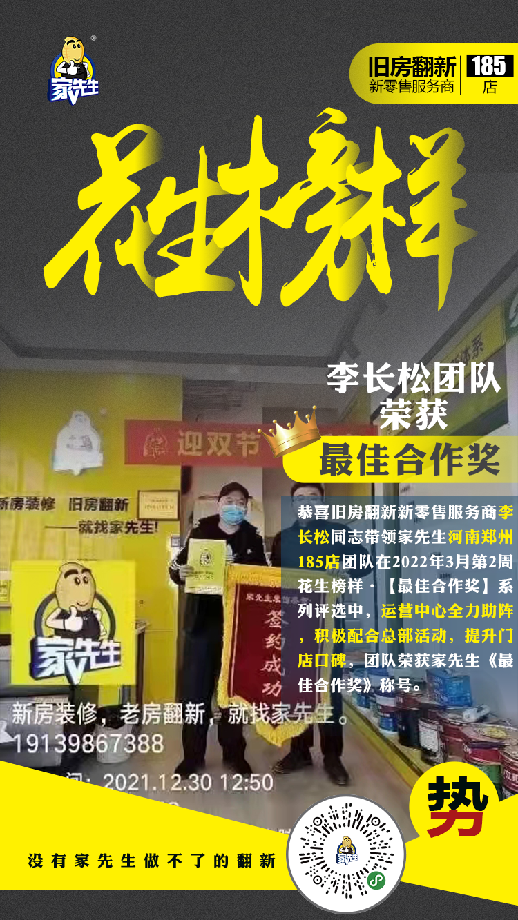 恭喜旧房翻新新零售服务商李长松同志带领家先生河南郑州185店团队在2022年3月第2周花生榜样·【最佳合作奖】系列评选中,运营中心全力助阵,积极配合总部活动,提升门店口碑,团队荣获家先生《最佳合作奖》称号。