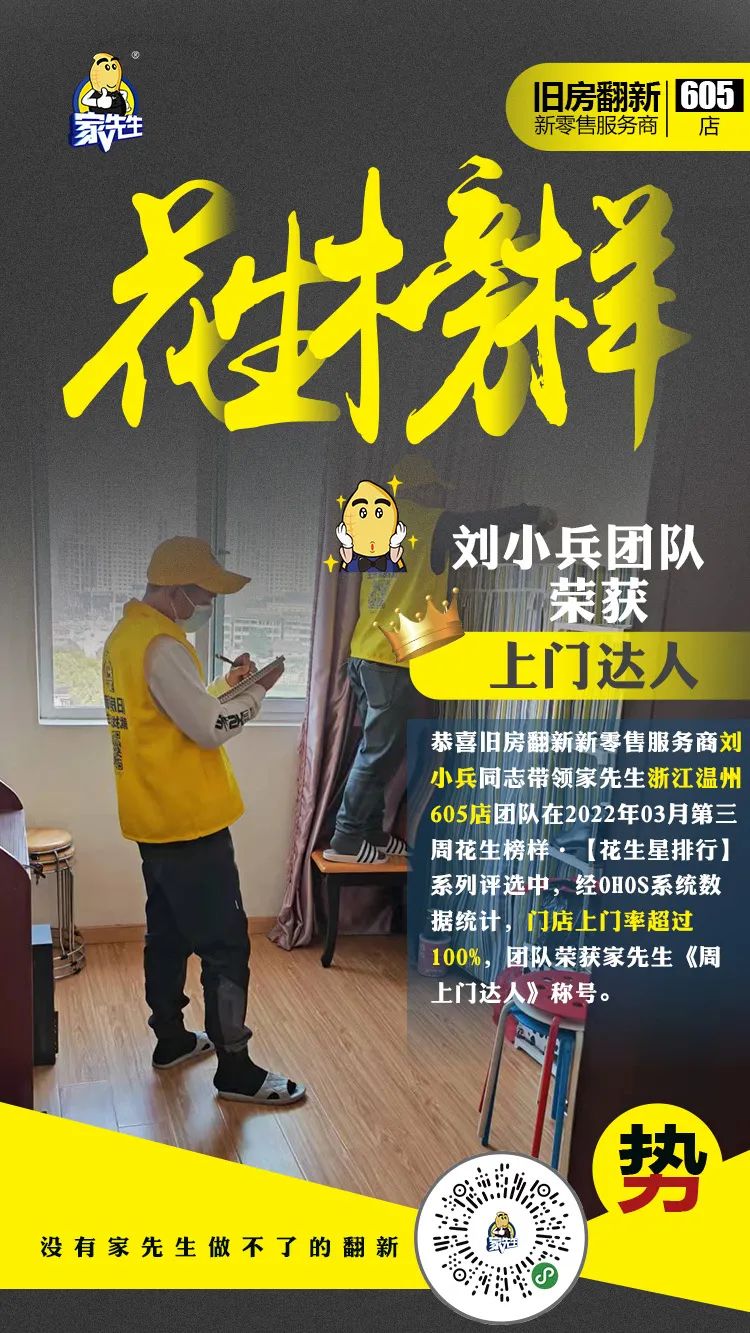 恭喜旧房翻新新零售服务商刘小兵同志带领家先生浙江温州605店团队在2022年03月第三周花生榜样·【花生星排行】系列评选中,经OHOS系统数据统计,门店上门率超过100%,团队荣获家先生《周上门达人》称号。