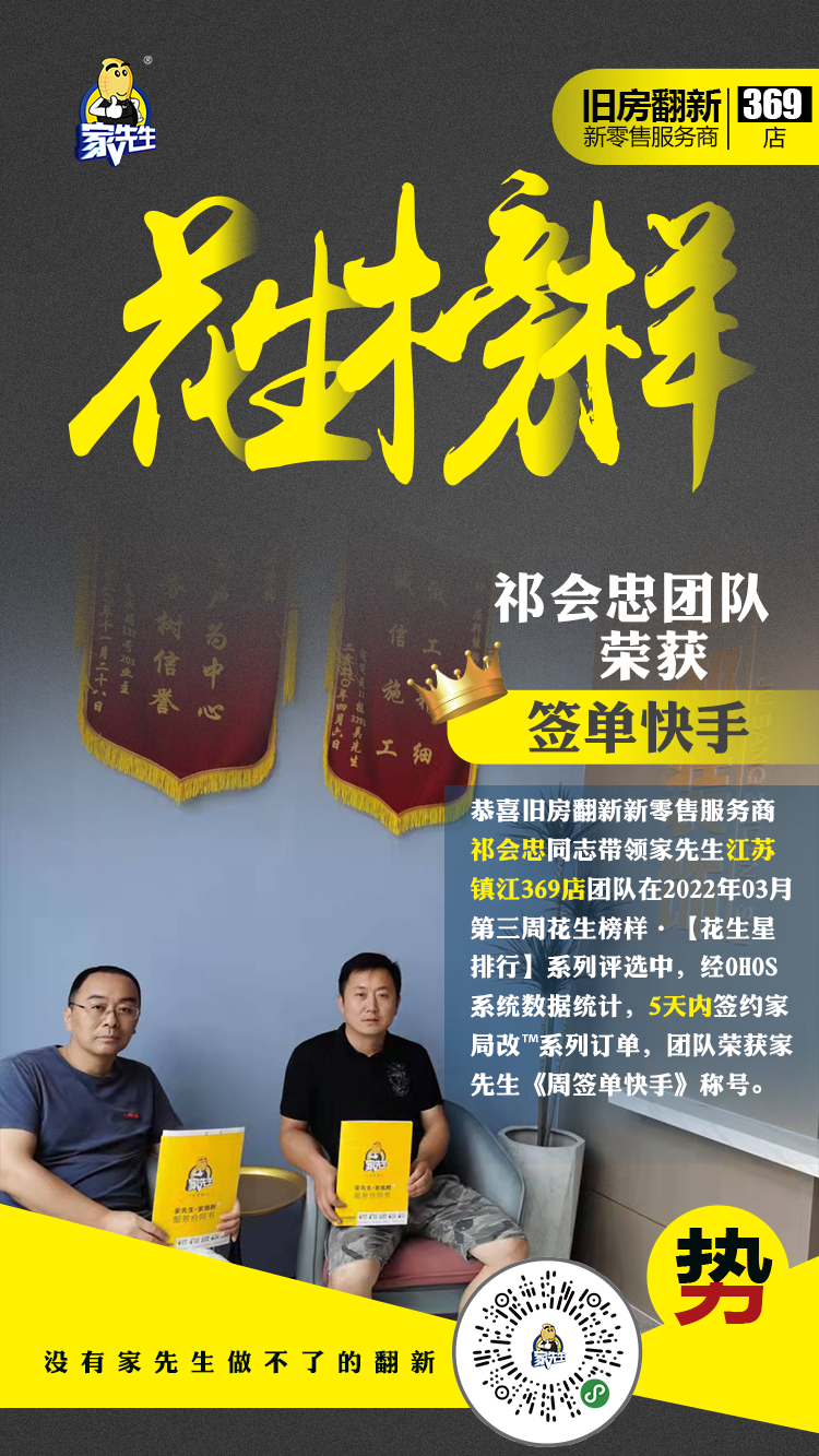 恭喜旧房翻新新零售服务商祁会忠同志带领家先生江苏镇江369店团队在2022年03月第三周花生榜样·【花生星排行】系列评选中,经OHOS系统数据统计,5天内签约家局改™系列订单,团队荣获家先生《周签单快手》称号。