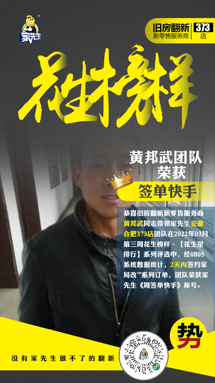 恭喜旧房翻新新零售服务商黄邦武同志带领家先生安徽合肥373店团队在2022年03月第三周花生榜样·【花生星排行】系列评选中,经OHOS系统数据统计,2天内签约家局改™系列订单,团队荣获家先生《周签单快手》称号。