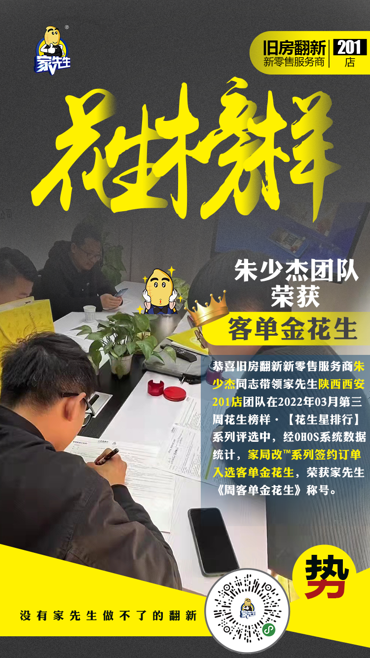 恭喜旧房翻新新零售服务商朱少杰同志带领家先生陕西西安201店团队在2022年03月第三周花生榜样·【花生星排行】系列评选中,经OHOS系统数据统计,家局改™系列签约订单入选客单金花生,荣获家先生《周客单金花生》称号。
