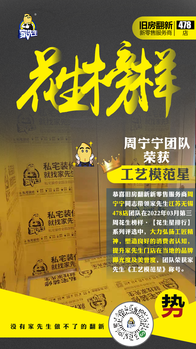恭喜旧房翻新新零售服务商周宁宁同志带领家先生江苏无锡478店团队在2022年03月第三周花生榜样·【花生星排行】系列评选中,大力弘扬工匠精神,塑造良好的消费者认知,提升家先生门店在当地的品牌曝光度及美誉度,团队荣获家先生《工艺模范星》称号。