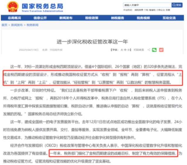 金税四期是金税工程的第四期项目,而金税工程是由国家税务总局推行的利用覆盖全国税务机关的计算机网络对增值税专用发票和企业增值税纳税状况进行严密监控的一个体系。到2022年以发票全领域、全环节、全要素电子化改革为突破口,启动金税四期建设,持续拓展税收大数据资源,联通内外涉税数据。